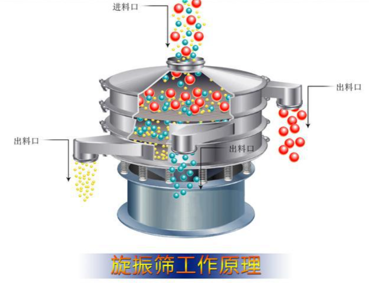 不銹鋼旋振篩由直立式振動電機作為激振源,電機上、下兩端安裝有偏心重錘,將電機的旋轉運動轉變為水平、垂直、傾斜的三次元運動,再把這個運動傳遞給篩面,使篩面上的物料一起運動,小于篩面孔徑的物料通過篩孔落到下層,大于篩面孔徑的物料從排料口排出,最終完成篩分工作。在實際運行過程中,還可以通過調節上、下兩端的相位角,改變物料在篩面上的運動軌跡,從而達到不同篩分目的。