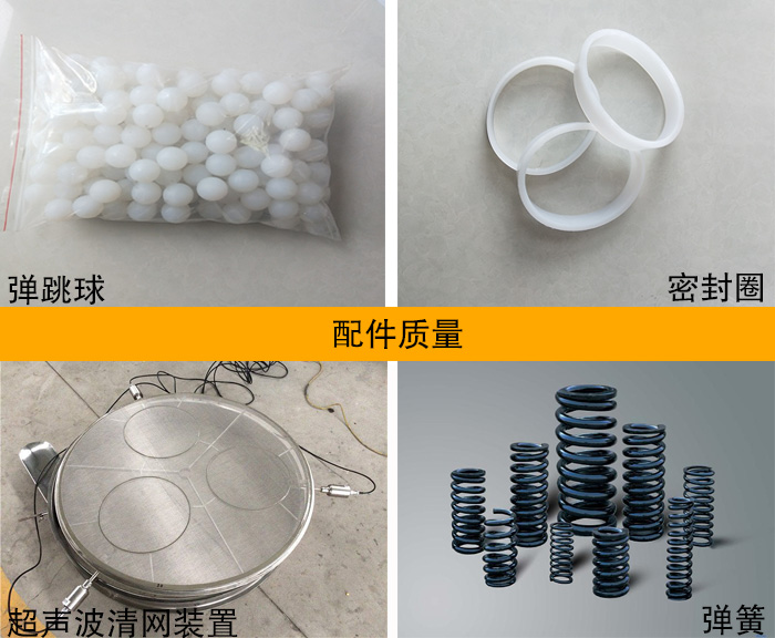 振動篩的配件有振動電機、減震彈簧、密封圈、清網裝置等。配件的質量也是衡量振動篩優劣的重要方面。我們以常見的彈跳球清網裝置為例,彈跳球的材質可分為橡膠和硅膠兩類,根據不同物料選用不同的材質,一旦使用的配件不是正規匹配的,在使用過程中就會出現清網不理想,對物料產生二次污染等問題。