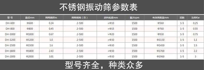 不銹鋼直線振動篩是在碳鋼直線振動篩的基礎(chǔ)上采用了不銹鋼材質(zhì),但是也是有所差異的,大漢的不銹鋼直線振動篩不只有半不銹鋼材質(zhì)的,還有全不銹鋼材質(zhì)的,型號種類非常齊全,具體參數(shù)詳見上圖參數(shù)表。