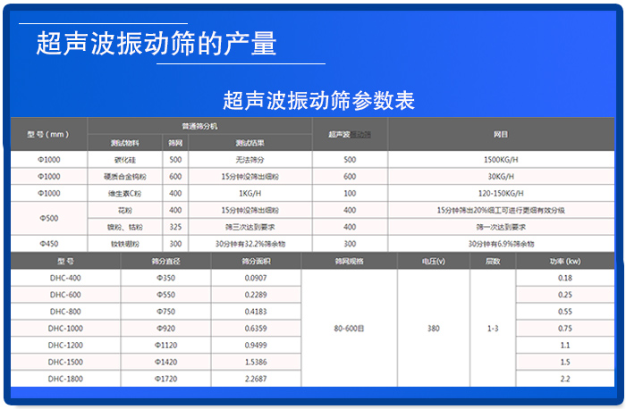 超聲波振動篩價格差異大的一大因素就是因為產(chǎn)量的差異非常大,產(chǎn)量越高,篩分的物料就越多,帶來的經(jīng)濟效益就越多,價格就越高。具體的參數(shù)如上圖所示。