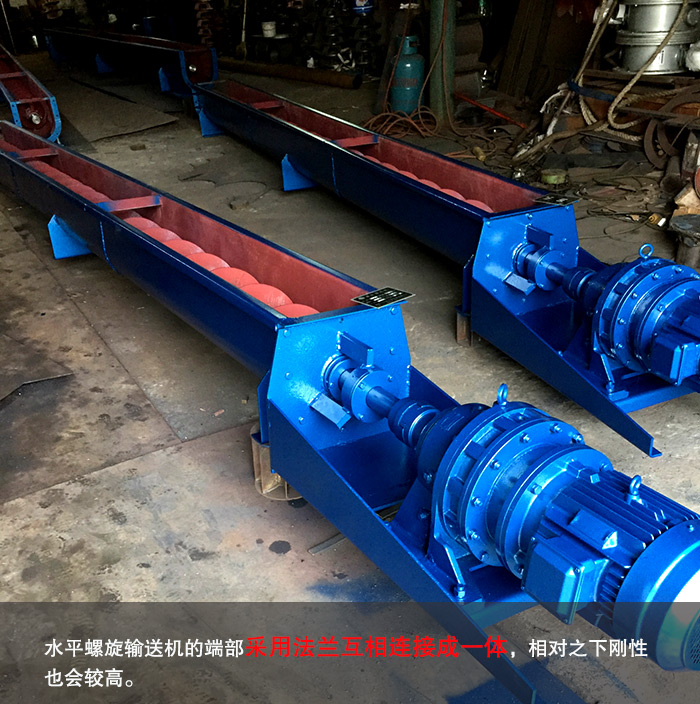 水平螺旋輸送機(jī)外殼采用無縫鋼管制作其密封性好,可以較少一些環(huán)境的污染,而水平螺旋輸送機(jī)的端部采用法蘭互相連接成一體,相對(duì)之下剛性也會(huì)較高。
