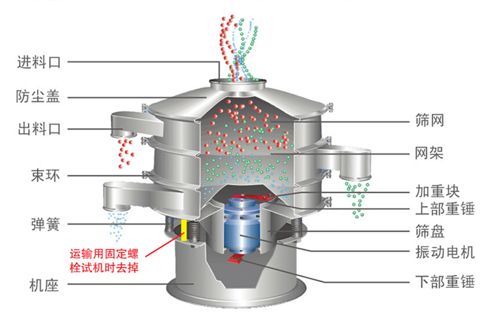 旋振篩由直立式電機作激振源,電機上、下兩端安裝有偏心重錘,將電機的旋轉運動轉變為水平、垂直、傾斜的三次元運動,再把這個運動傳遞給篩面。