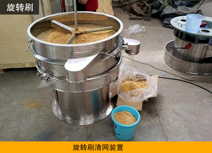 旋轉(zhuǎn)刷清網(wǎng)裝置是由圓柱形硅膠組成,將旋轉(zhuǎn)刷安裝在篩框中心位置,有聯(lián)軸器連接,啟動篩機時旋轉(zhuǎn)刷同時啟動,從而對篩框底部進行清網(wǎng)的工作,常用機型為搖擺篩。